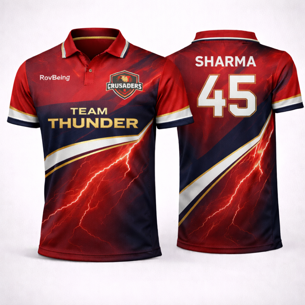 Unleash power on the pitch with the Team Thunder Red Lightning Cricket Jersey. Featuring dynamic lightning graphics and bold red tones, this jersey delivers unmatched visual impact.